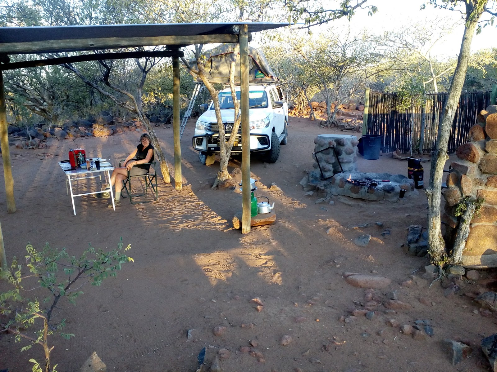 Route magnifique pour rejoindre Hoada campsite, installé sous d’imposants rochers, avec douche et WC en plein air muni d’un chauffe-eau à bois . Une petite piscine dans un trou de rocher nous permet de nous rafraîchir car il fait très chaud.